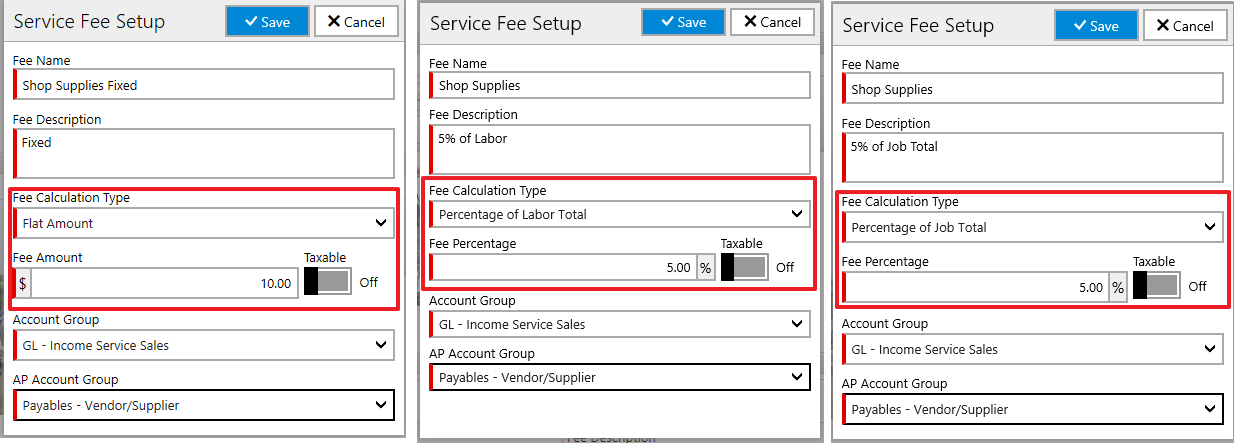 When setting up service fees you now have the option to make then dynamically calculate based on either the Job Total or the Labor Total
