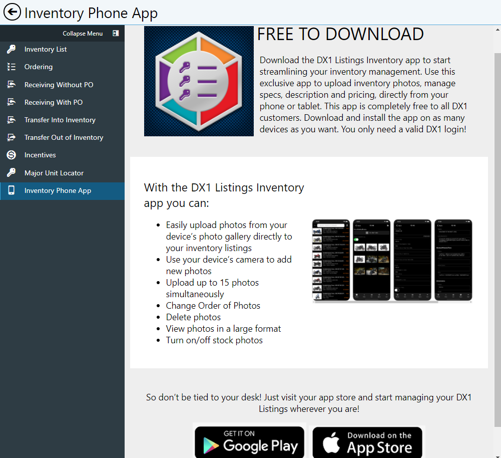 Link Added to Promote DX1 Listing Inventory App on Listing Inventory and Major Unit Management. The link is named Inventory Phone App. When clicked, it links to a page with description and images of the Listing Inventory app as well as links to the App Store and Google play.