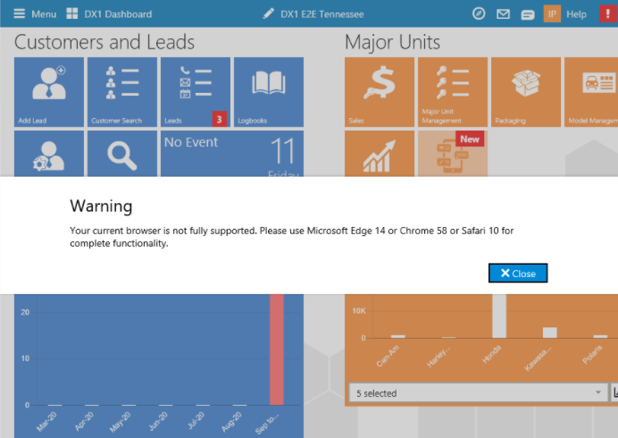 While we will still allow users to log into and use DX1 with IE11 and older browsers we will now warn them that they need to use Microsoft Edge 14 or Chrome 58 or Safari 10 for complete functionality. The warning is displayed 2 times, First while the user is logging in and the second time in the dashboard.