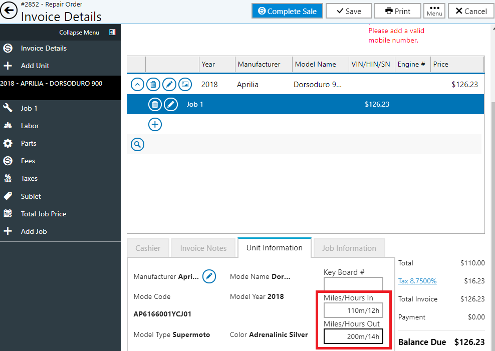 We now allow users to enter text as well as numbers in the Miles/Hours In & Out boxes on the Service Unit Information Tab
