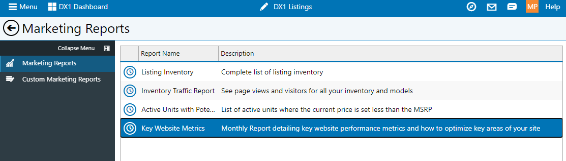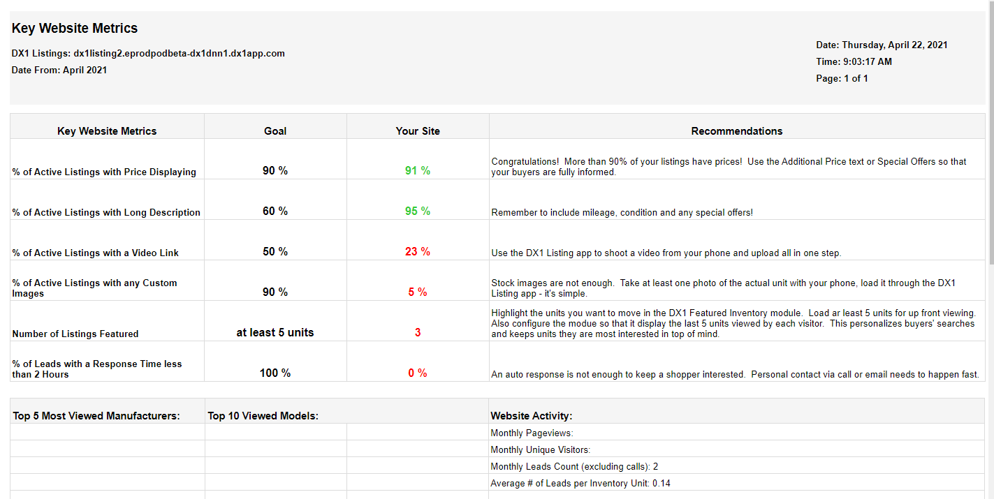 We have added a new report to help monitor your website's performance against key website-marketing best practices. This report will provide scores for the dealership within certain categories against industry benchmarks. You can configure to receive this report monthly in your email or can view it under the Reports tile in the Marketing Communication tile-set.