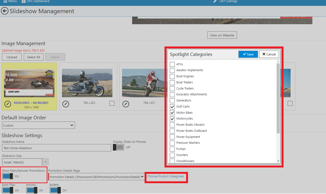 You can now choose to only show Manufacturer Promotions for the specific product category you carry in your dealership. We have added a setting in DX1 for you to filter the manufacturer promotion based on product category. When the manufacturer promotion is enabled, you will see a link next to it to select the product category for which you wish to display promotions on your website. Only the promotions for selected product categories will display on your website slideshow.