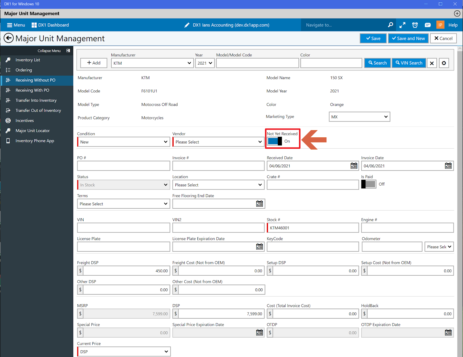 To use the feature simply click the “Not Yet Received” toggle when receiving the unit