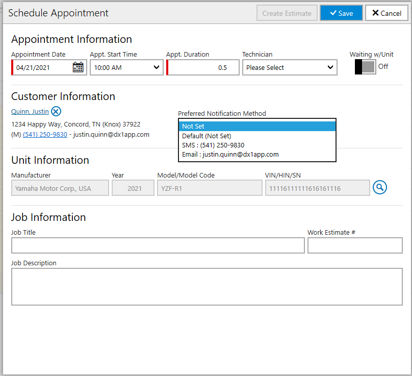 We have added a preferred notification method drop-down to the Schedule Appointment Pop Up. This allows you to set a preferred notification method for the customer if it had not previously been set.