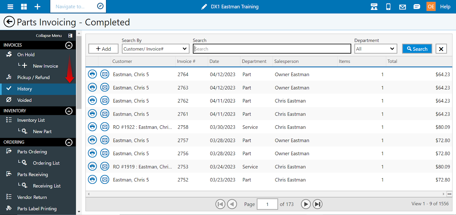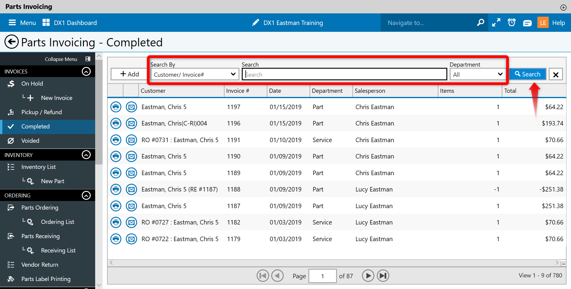 The user can either search for the customer or click on the customer name if shown on the first screen. Click on the customer name to open the completed invoice.