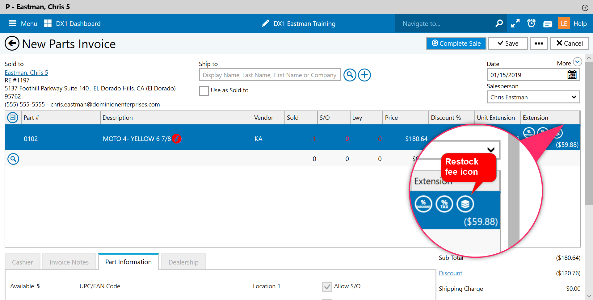 DX1 has now created a new invoice that will be linked with the original ( in the example Parts Invoice # 1197) Dealers can choose to charge or remove a default restock fee by clicking on the icon as shown. For further details on how restock fees work click on the link below.