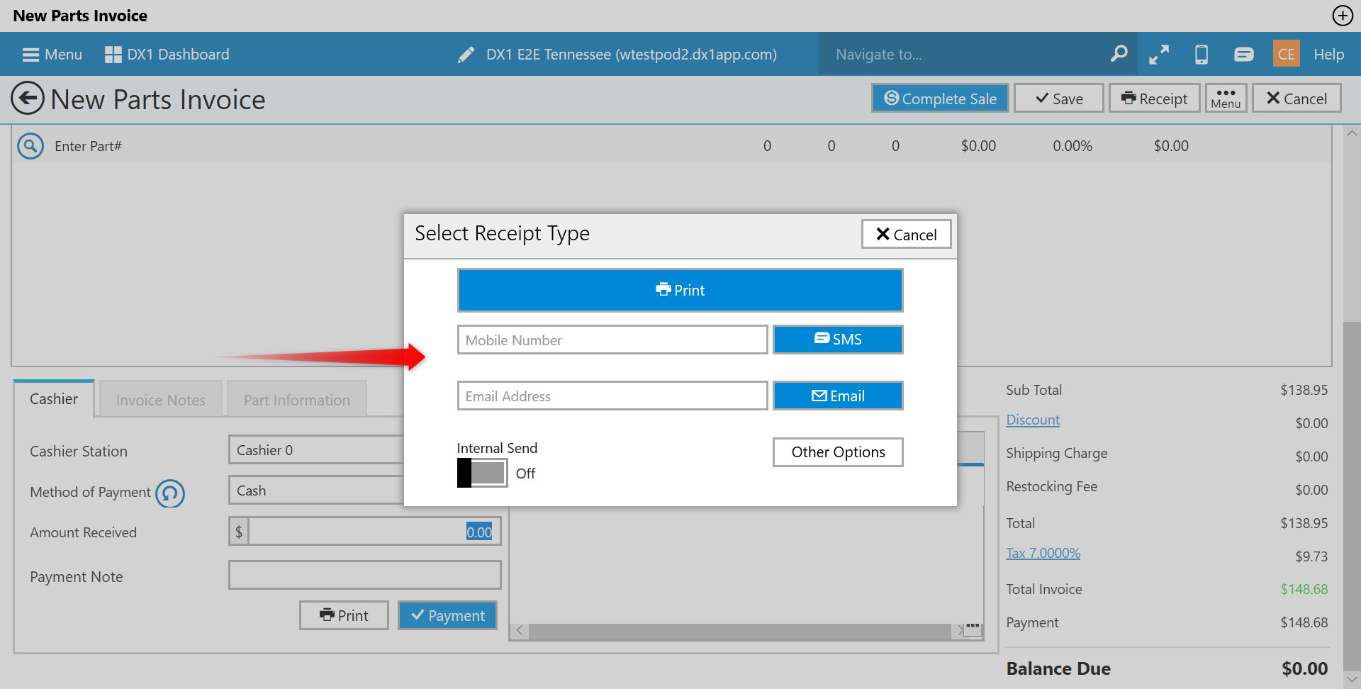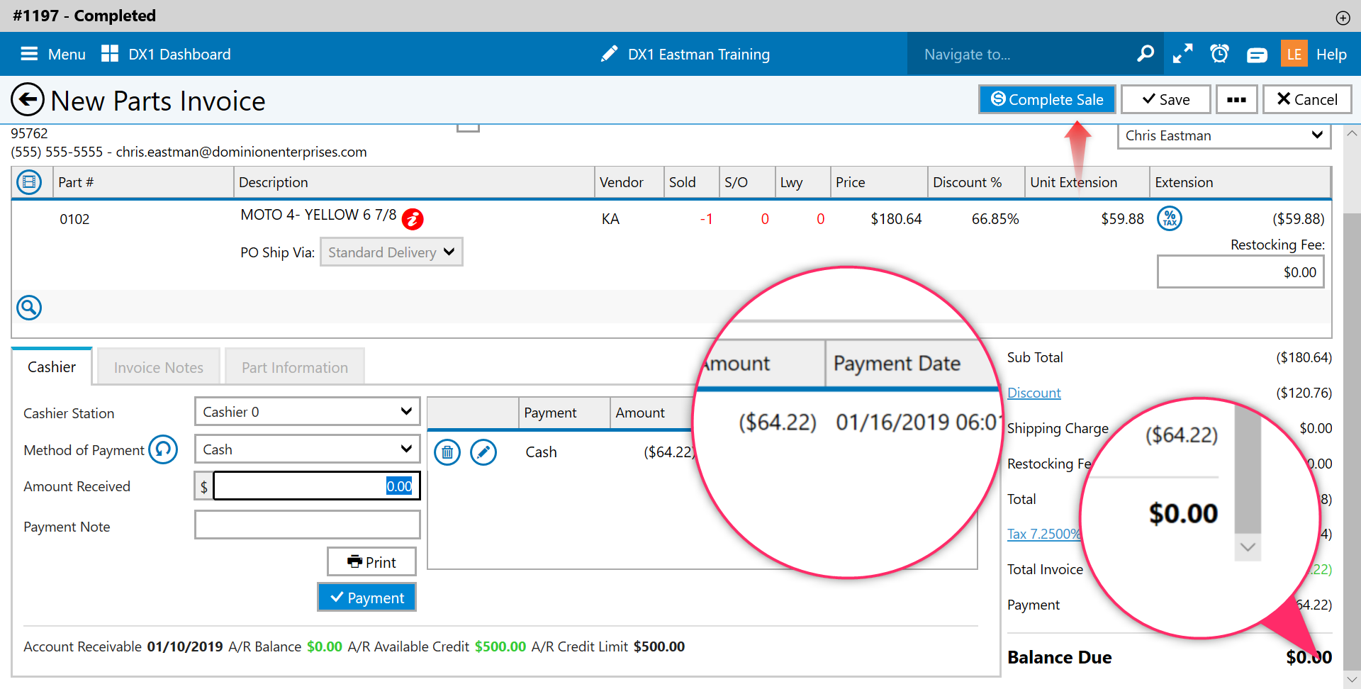 The amount of the return will show in the payment section of the invoice. With all parts returned the Balance Due will show zero. Click the Complete Sale button in the upper right hand corner The return is now complete.