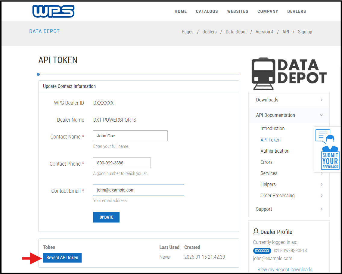 The API Token page will reload with a new section containing your dealer-specific Token. If the page does not reload, simply hit the browser back button or click the API Documentation option, then the API Token option again.