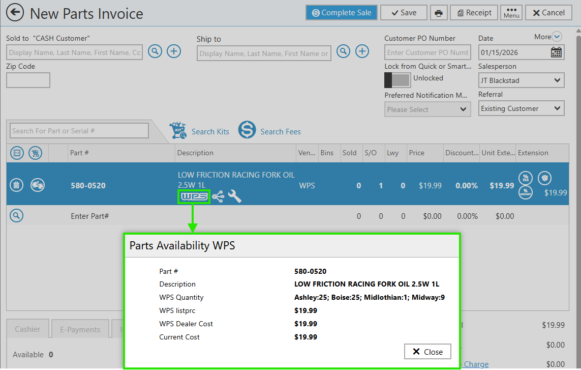 Setting this integration up is more than just dealer-specific pricing; it also allows you to check WPS Parts Warehouse availability on the Parts Invoice & Parts Ordering pages and enables Integrated Ordering.