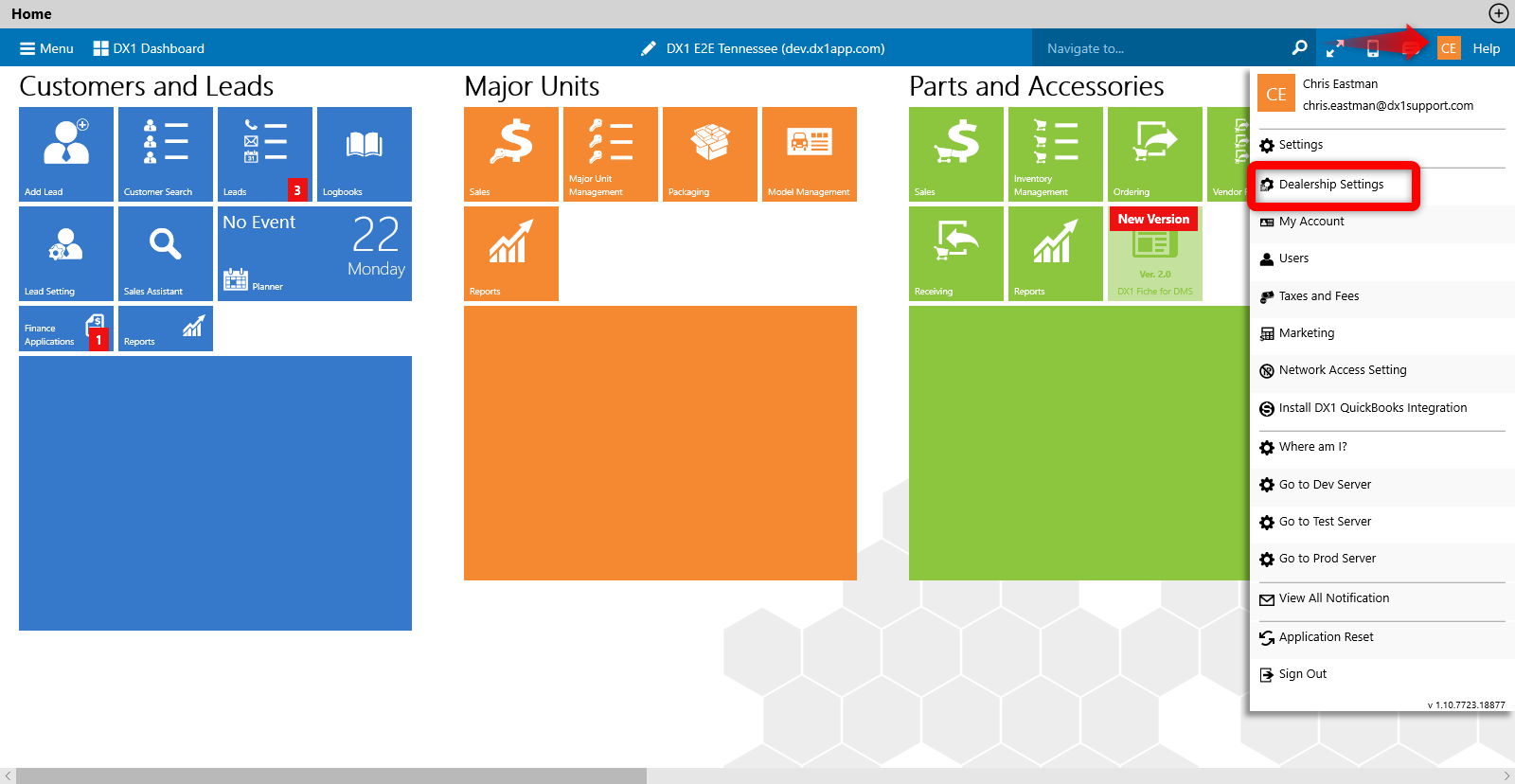 Click on your users initials in the upper right hand corner then select Dealership Settings