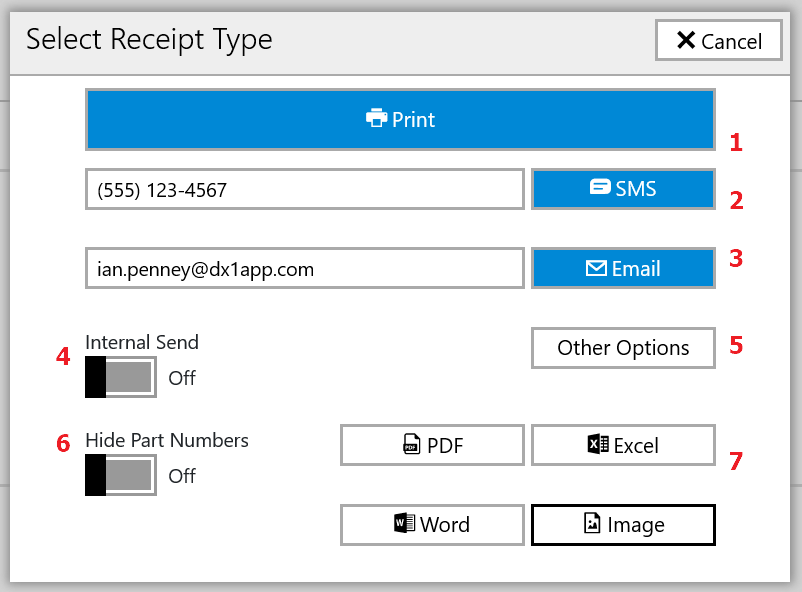 This feature gives you the option to Print your Parts and Service receipts in the traditional format and also gives you the option to send them electronically via SMS Text message or as an Email attachment.