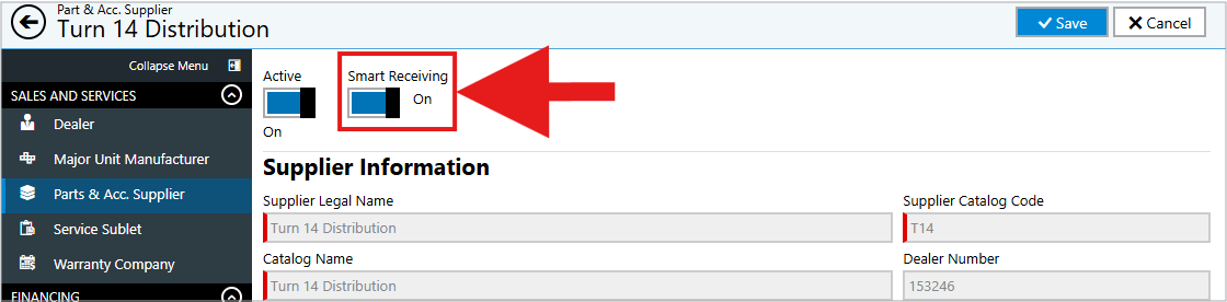 2. Find the Part & Acc. Supplier Vendor you would like to enable Smart Receiving for